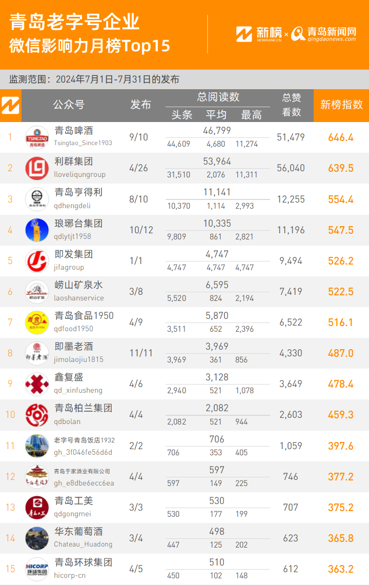 2024年7月青島老字號企業(yè)微信影響力排行榜TOP15即刻揭曉。本期榜單統(tǒng)計周期是2024年7月1日到2024年7月31日。