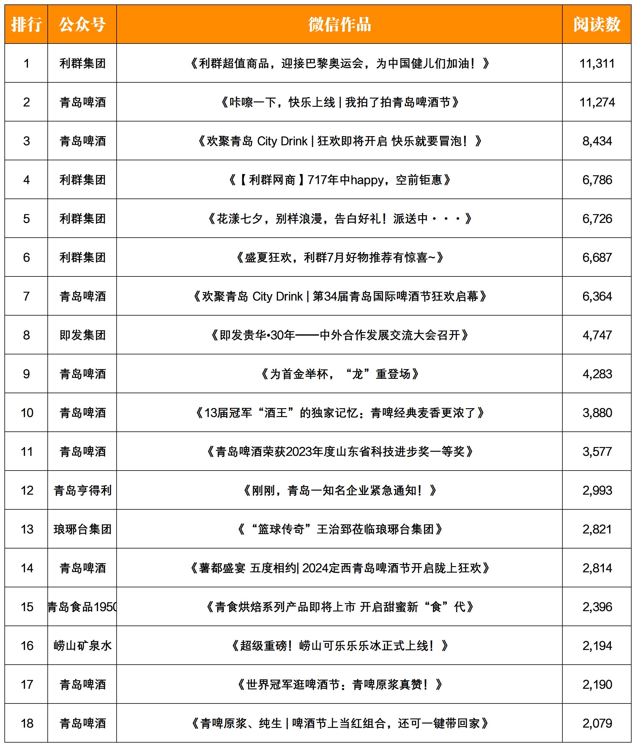 “青島啤酒”7月份發(fā)布文章10篇,總閱讀數4.6w+,位于榜單冠軍;“利群集團”7月份發(fā)布文章26篇,總閱讀數5.3w+,位于榜單亞軍;“青島亨得利”7月份發(fā)布文章10篇,總閱讀數1.1w+,位于榜單季軍。