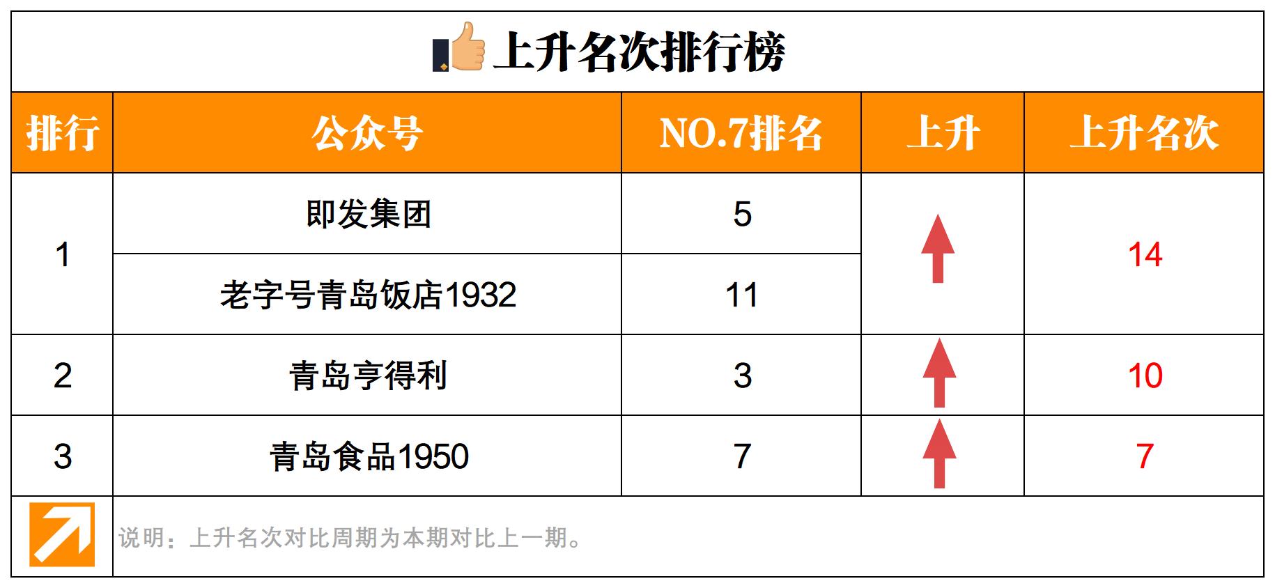 “青島食品1950”本期上升七名,位居總榜單第七名,上升名次排行榜第三。