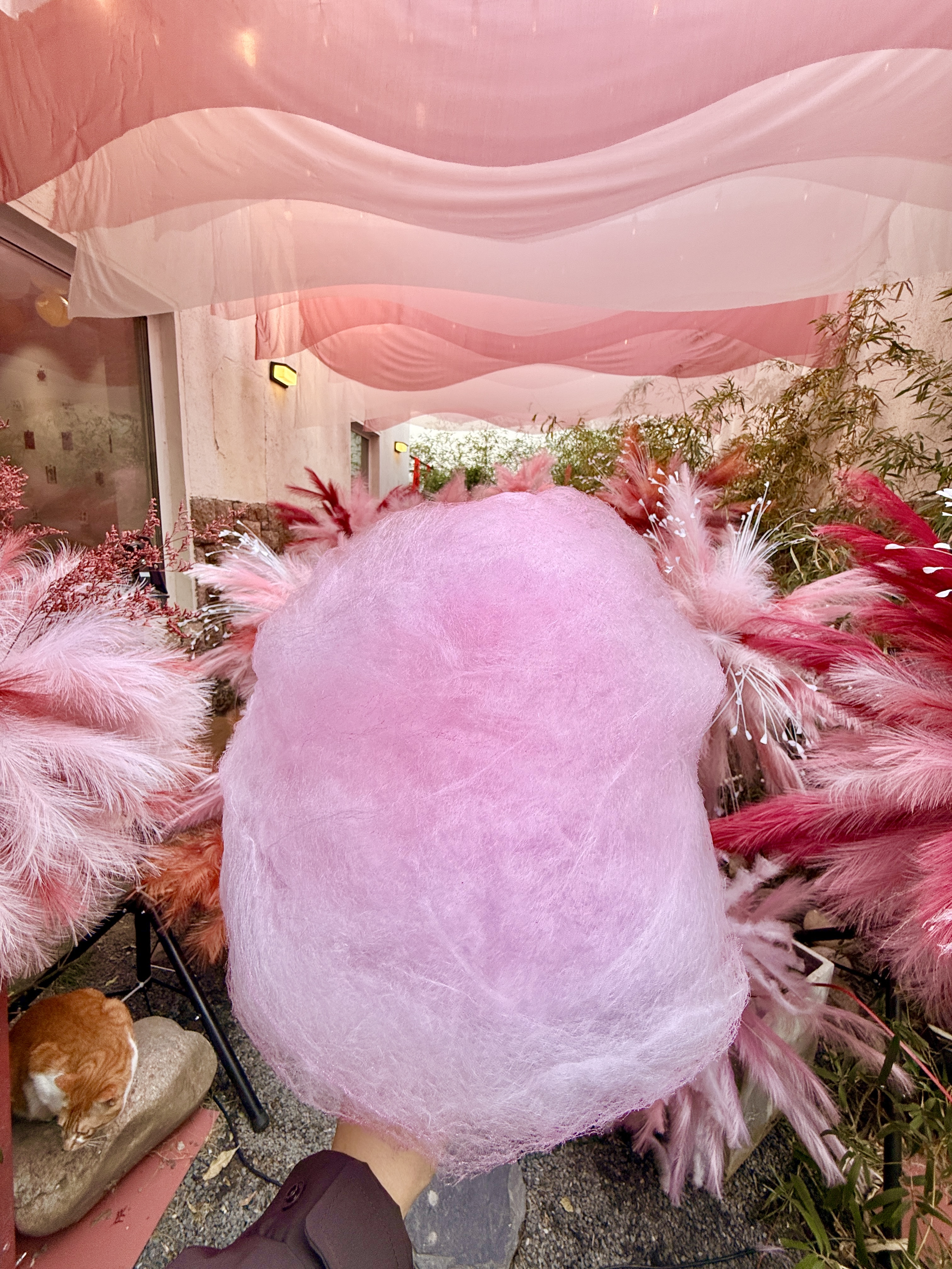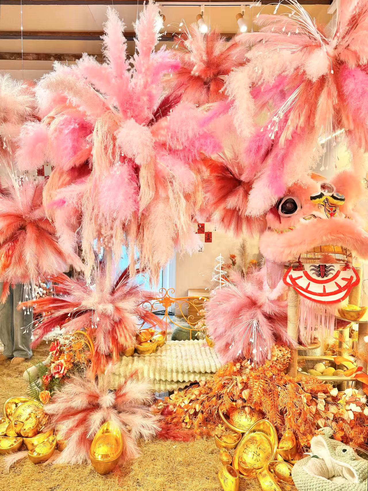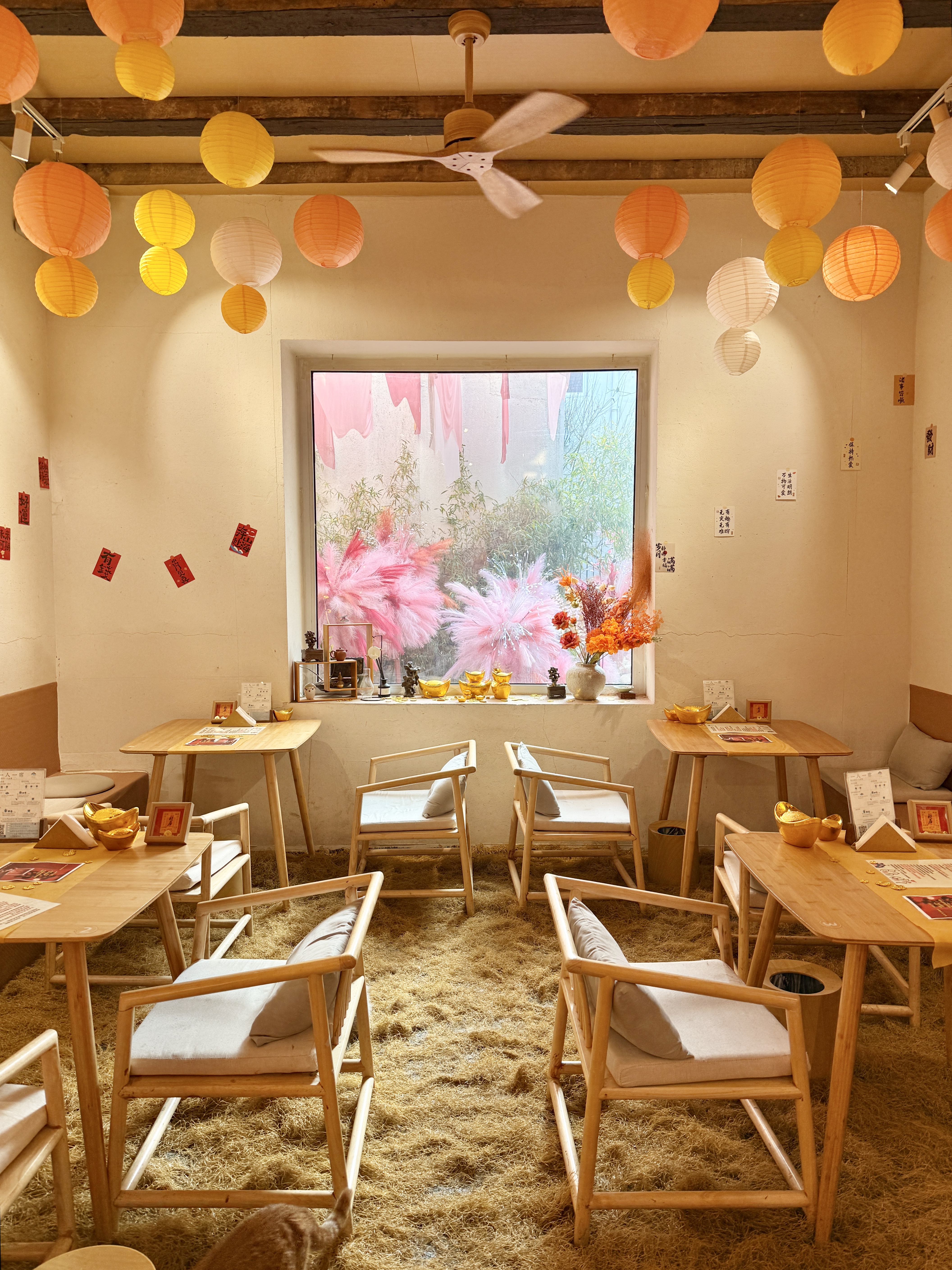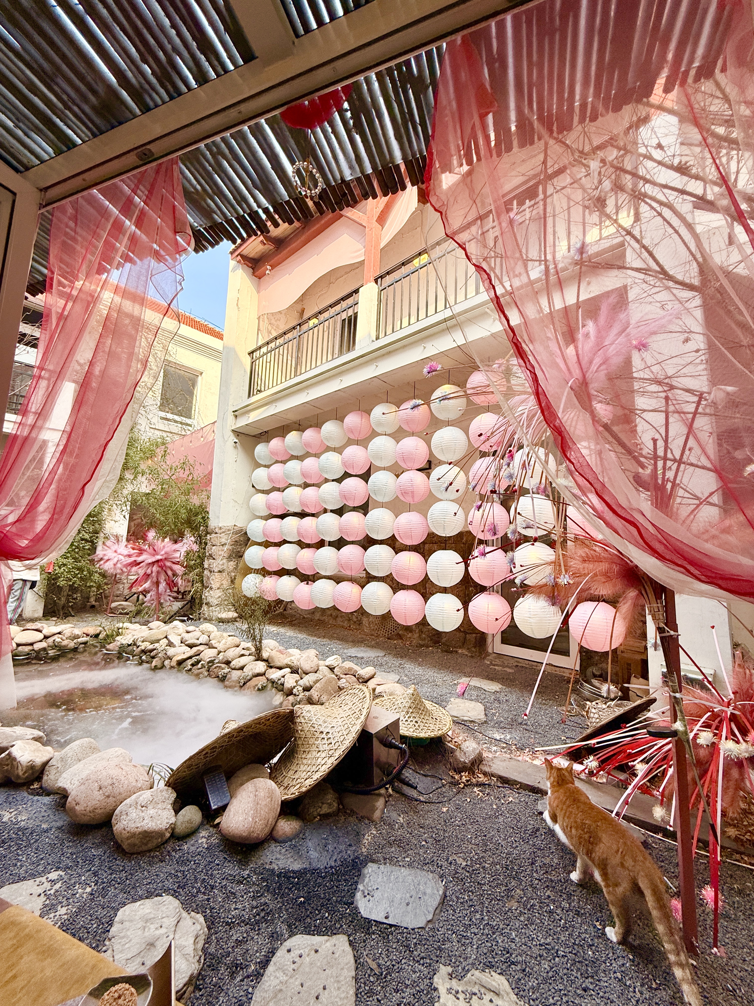 從室內(nèi)到庭院全都是粉色系的新春裝置,院落一隅還有春聯(lián),復古又清新,店里的喵主子們也盛裝出席,都預備備好,準備提前過年啦!