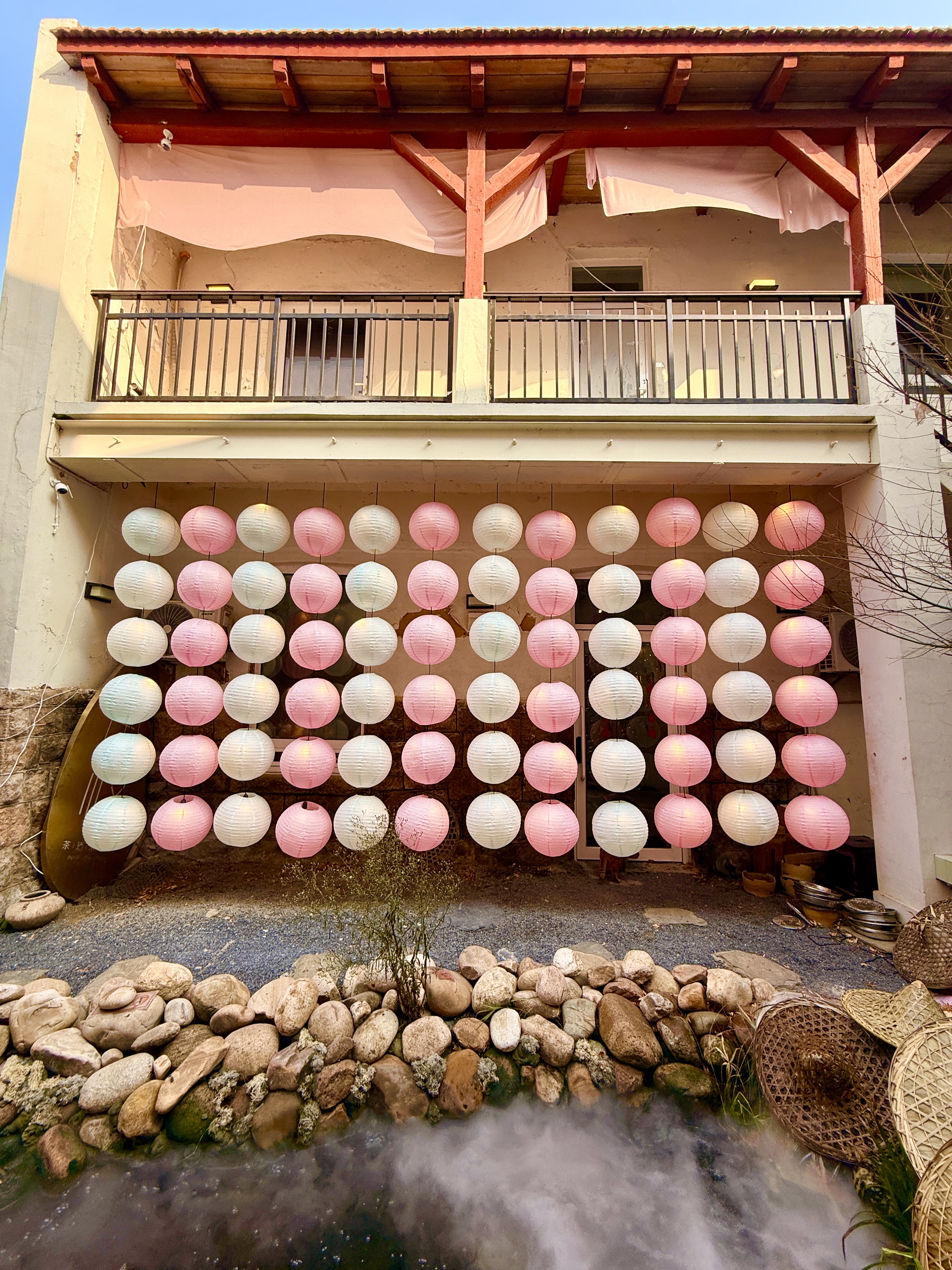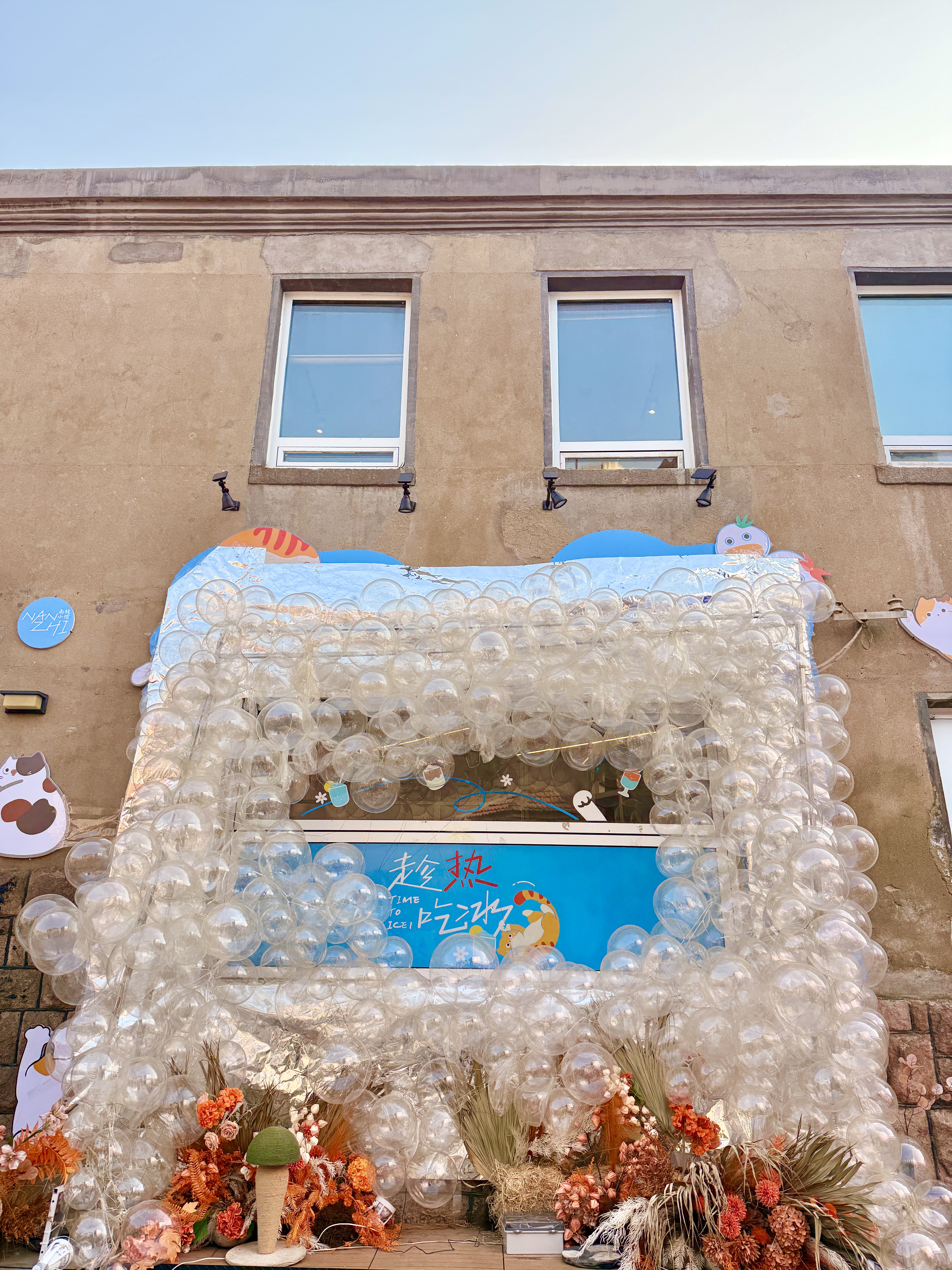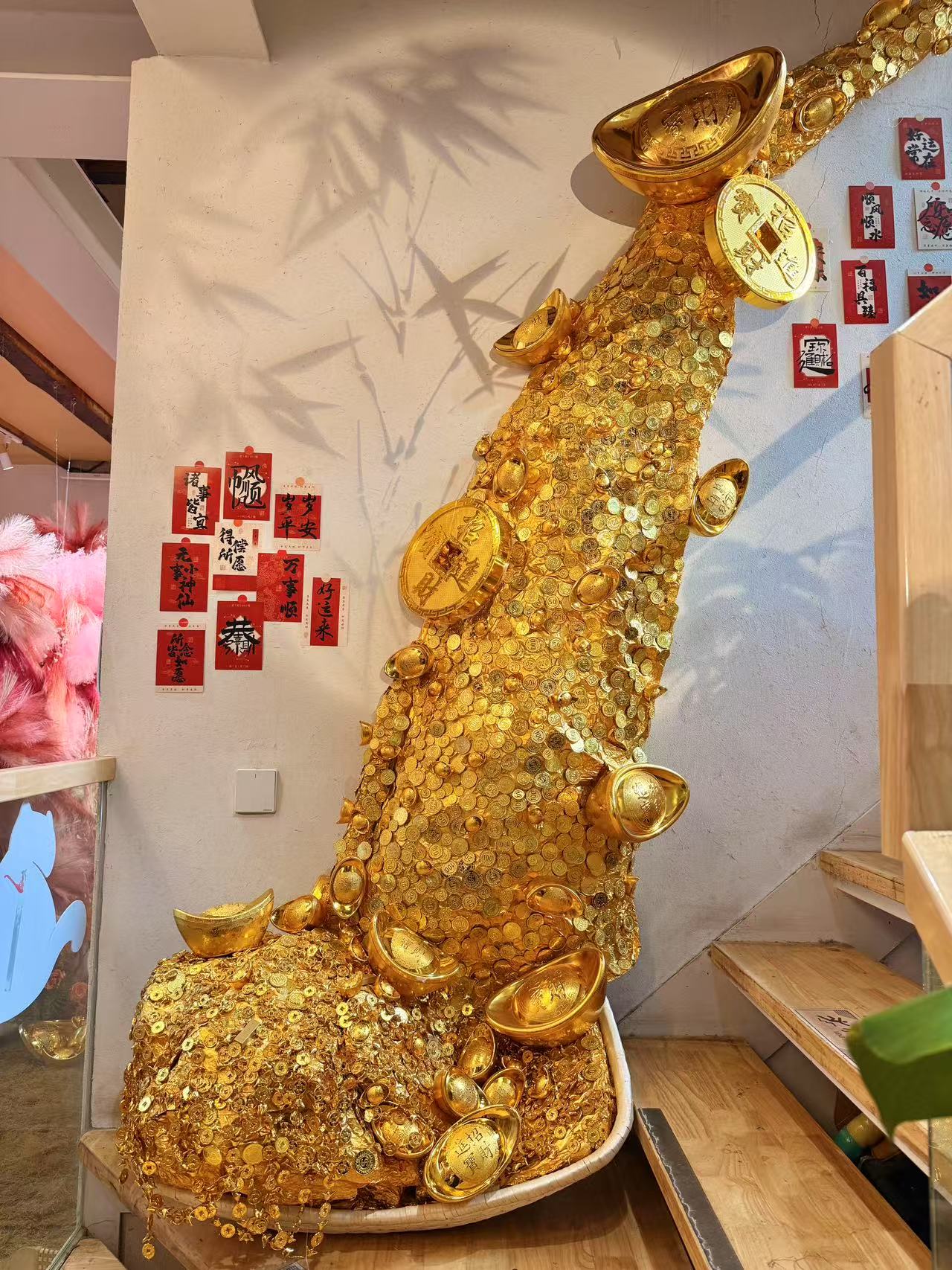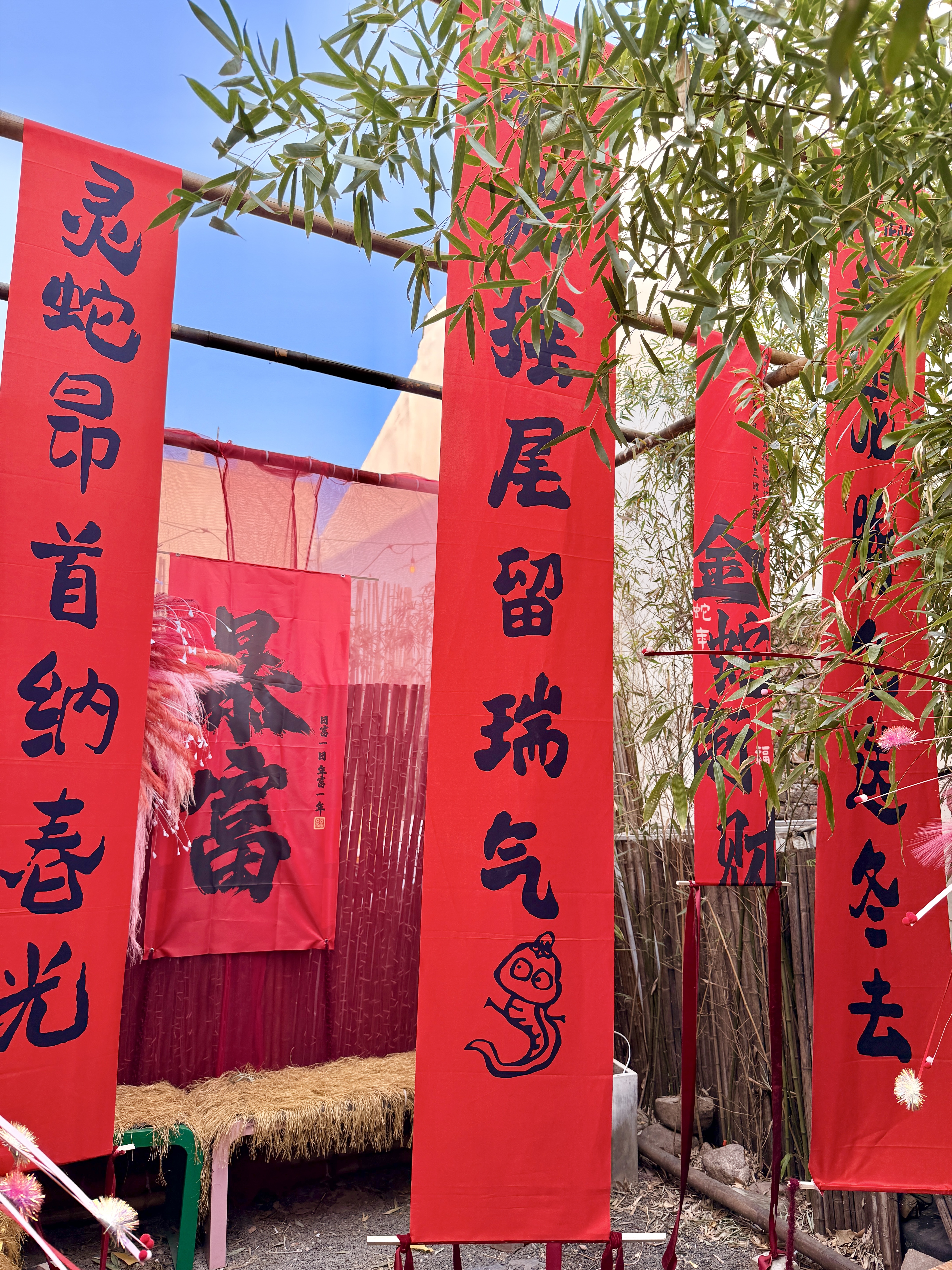 從室內(nèi)到庭院全都是粉色系的新春裝置,院落一隅還有春聯(lián),復古又清新,店里的喵主子們也盛裝出席,都預備備好,準備提前過年啦!
