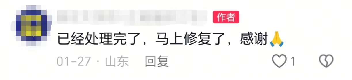 網(wǎng)友隨后跟帖點贊處理結果:“已經(jīng)處理完了,馬上修復了,感謝。”