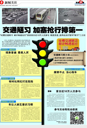 旅游高潮臨近,青島交通擁堵的現(xiàn)象逐漸抬頭。大家在開車或行路的過程中,有哪些不文明行為最令你難以忍受?你對路段的規(guī)劃、路段調(diào)整方案、路段設置等有哪些金點子?由青島早報、青島新聞網(wǎng)聯(lián)合策劃《深度青島之文明交通篇》推出