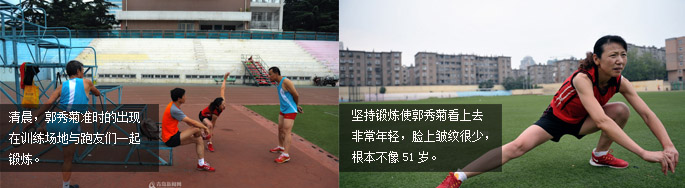 清晨4點(diǎn)半,郭秀菊準(zhǔn)時(shí)起床,簡單的洗漱和早餐之后,清晨5點(diǎn),一身運(yùn)動(dòng)短裝的郭秀菊準(zhǔn)時(shí)踏上公交首班車,經(jīng)過半小時(shí)車程,到達(dá)一家大學(xué)的操場。這是她保持了二十多年的晨跑習(xí)慣,每天兩小時(shí),從不遲到也從不缺席。 先慢跑五圈,小步跑,高抬腿,弓箭步;再做20個(gè)俯臥撐、50個(gè)杠鈴,之后才是正式訓(xùn)練開始。就是這樣,20年來堅(jiān)持晨跑訓(xùn)練從不間斷,同一訓(xùn)練場地上晨練的跑友們自告奮勇,為郭秀菊當(dāng)起了私人教練和陪練?!?a target="_blank" class="cYellow" >[詳情]