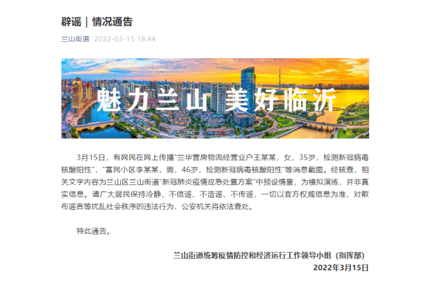 這則消息不實!臨沂市蘭山區(qū)蘭山街道發(fā)布辟謠通告