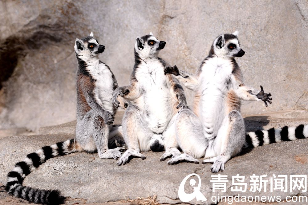 青島森林野生動(dòng)物世界 環(huán)尾狐猴圍坐一起曬太陽萌態(tài)十足