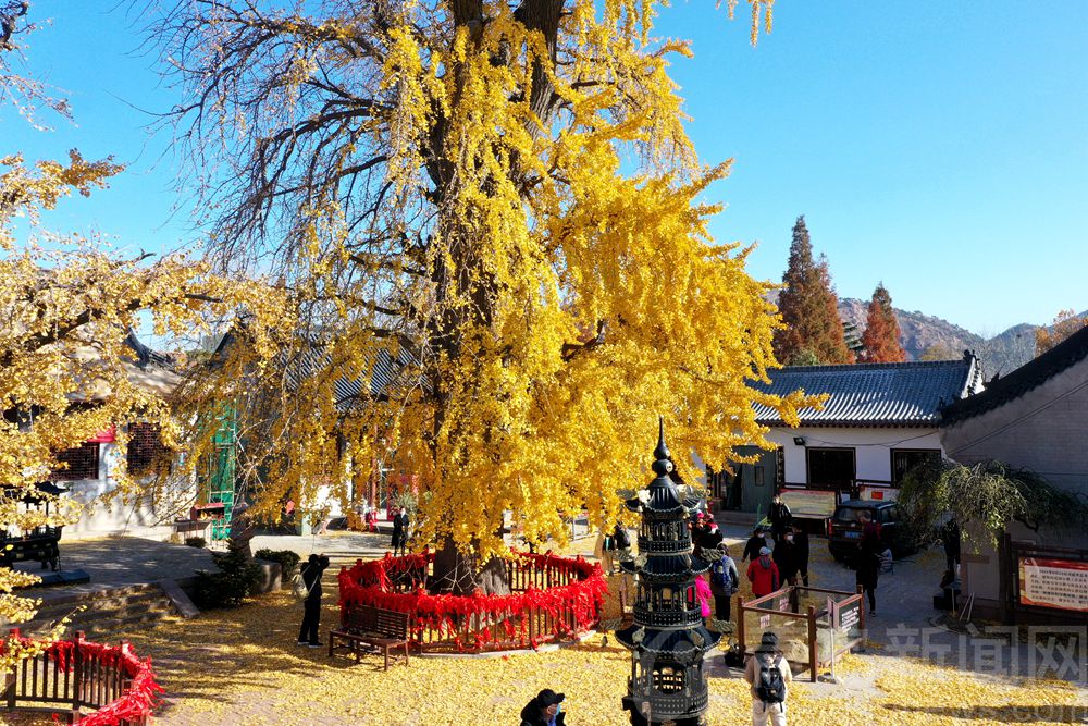 城陽法海寺一種別樣景致 銀杏樹葉飄落滿地如金黃色地毯