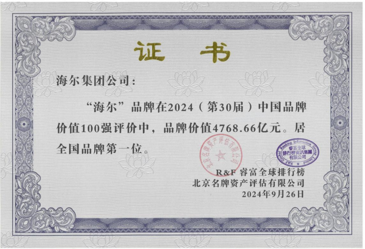 睿富發(fā)布2024中國品牌價值100強 海爾連續(xù)23年位居榜首