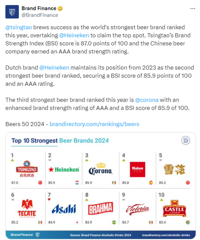 青島啤酒摘得Brand Finance 2024年度全球啤酒品牌力榜單冠軍