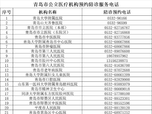 收藏!青島52家公立醫(yī)療機構(gòu)公布預(yù)約陪診服務(wù)電話