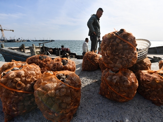海上“秋收”!膠州灣大海螺日上岸數(shù)千斤