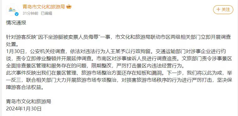 青島市文旅局最新通報(bào):王某行政拘留!涉事企業(yè)停業(yè)整頓!景區(qū)全面排查整改!